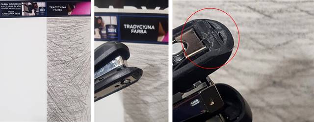 A o intensywności testowania farby niech świadczy stopień zużycia plastikowej części spinacza do papieru, która starła się ok. 4 mm...