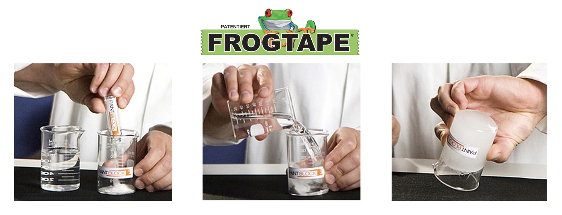 All FrogTape® brand painter’s tapes are treated with patented PaintBlock® Technology, a super-absorbent polymer that reacts with the water in latex paint and instantly gels to form a micro-barrier that seals the edges of the tape, preventing paint bleed and the need for touch-ups.