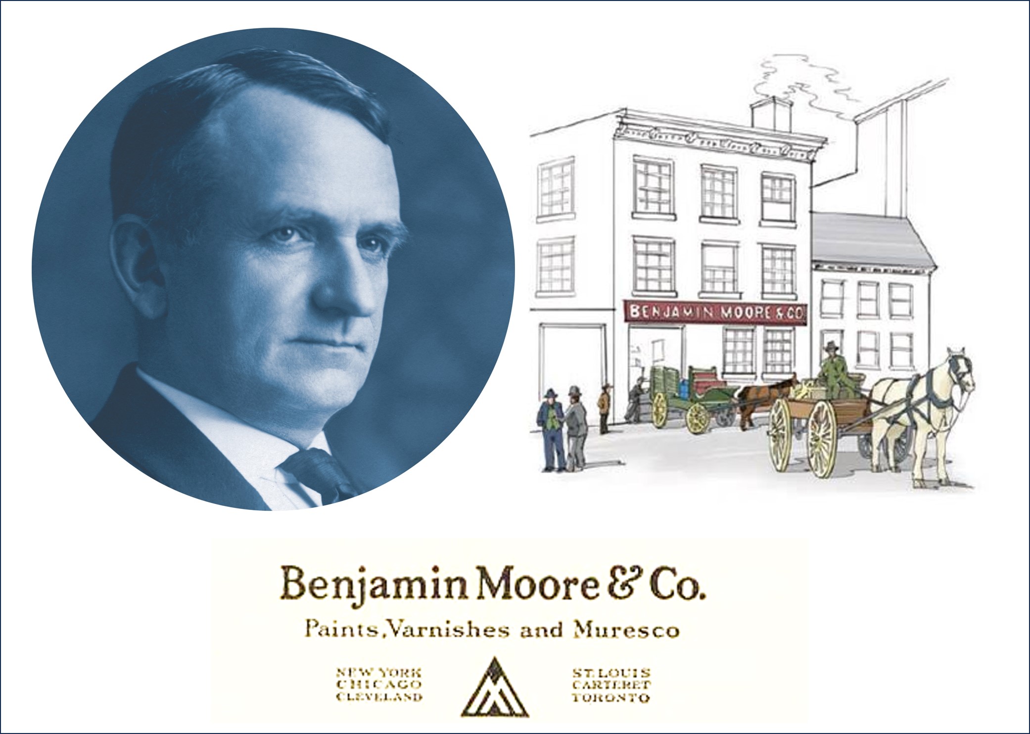 Benjamin Moore, założyciel Benjamin Moore & Co. urodził się w 1855 roku w Irlandii (zm. 1917 r.). Jego ojciec, również Benjamin służył w Imperial Army of Her Majesty, Queen Victoria, a przechodząc na emeryturę zamieszkał został farmerem i na stałe w Irlandii. To właśnie tutaj, w Ballybay, County Monaghan dorastał młody Benjamin.