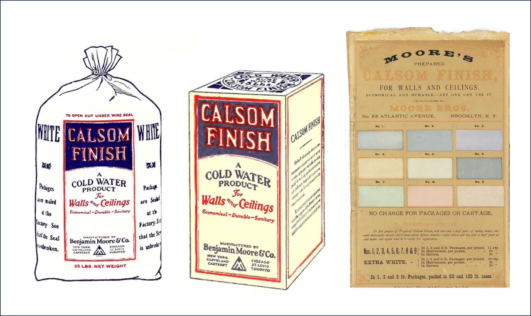 Farba „Moore’s® Prepared CALSOM Finish” (calsomine paint) produkowana była w kolorze białym oraz w gamie 12 pastelowych odcieni. Produkt w formie proszku wymagał jedynie dodatku zimnej wody.