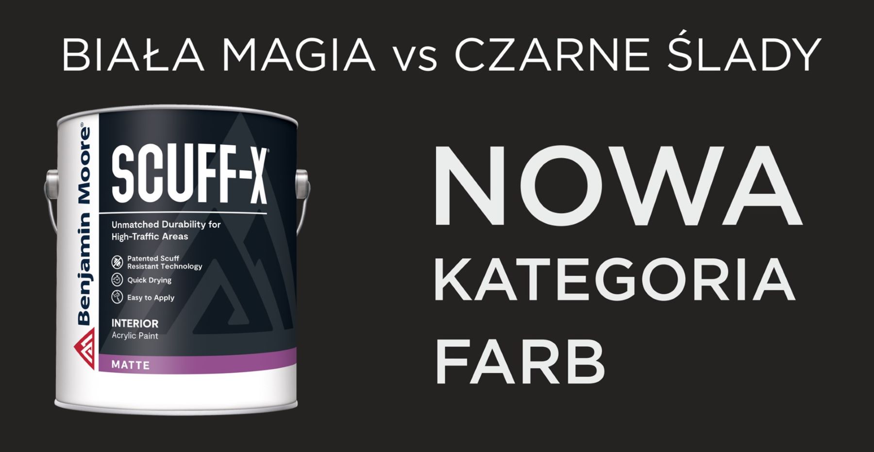 Wodorozcieńczalna farba akrylowa z innowacyjną, opatentowaną technologią „Scuff-Resistant” odporna na powstawanie czarnych śladów i przetarć, do malowania ścian w przestrzeniach o wysokim natężeniu ruchu. Mat.