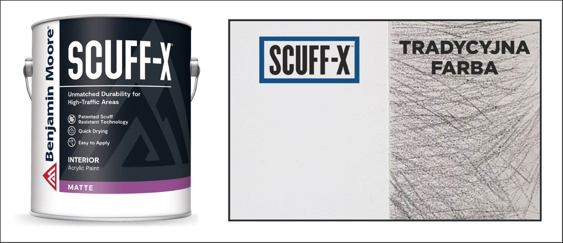 Wodorozcieńczalna, jednoskładnikowa farba akrylowa Scuff-X™ z rewolucyjną, opatentowaną technologią „Scuff-Resistant” stanowi idealne rozwiązanie w przestrzeniach o wysokim natężeniu ruchu, np. hotelach, salach konferencyjnych, biurach, szkołach, szatniach, klubach fitness, samoobsługowych salonach sprzedaży, restauracjach, szpitalach, gabinetach zabiegowych, etc.