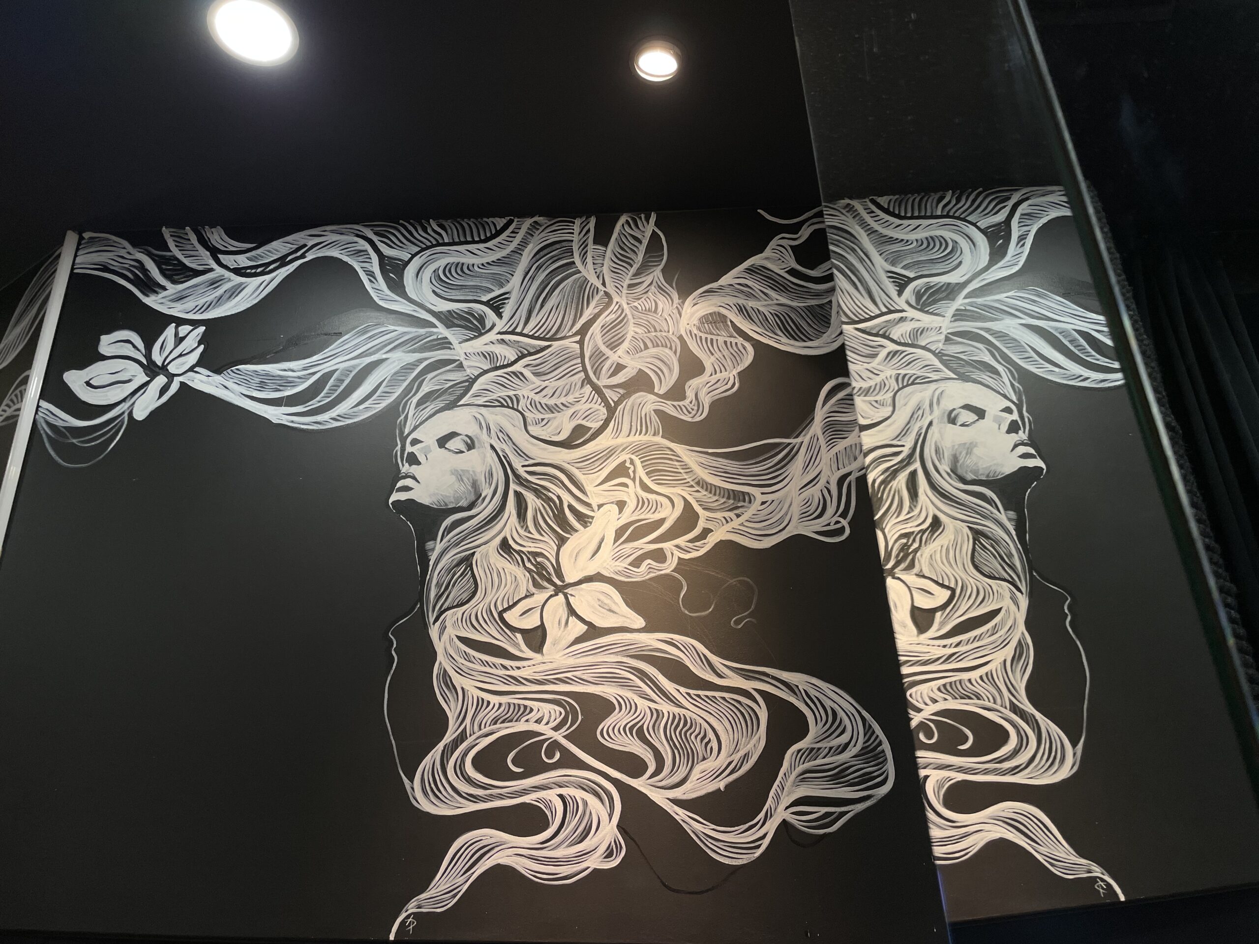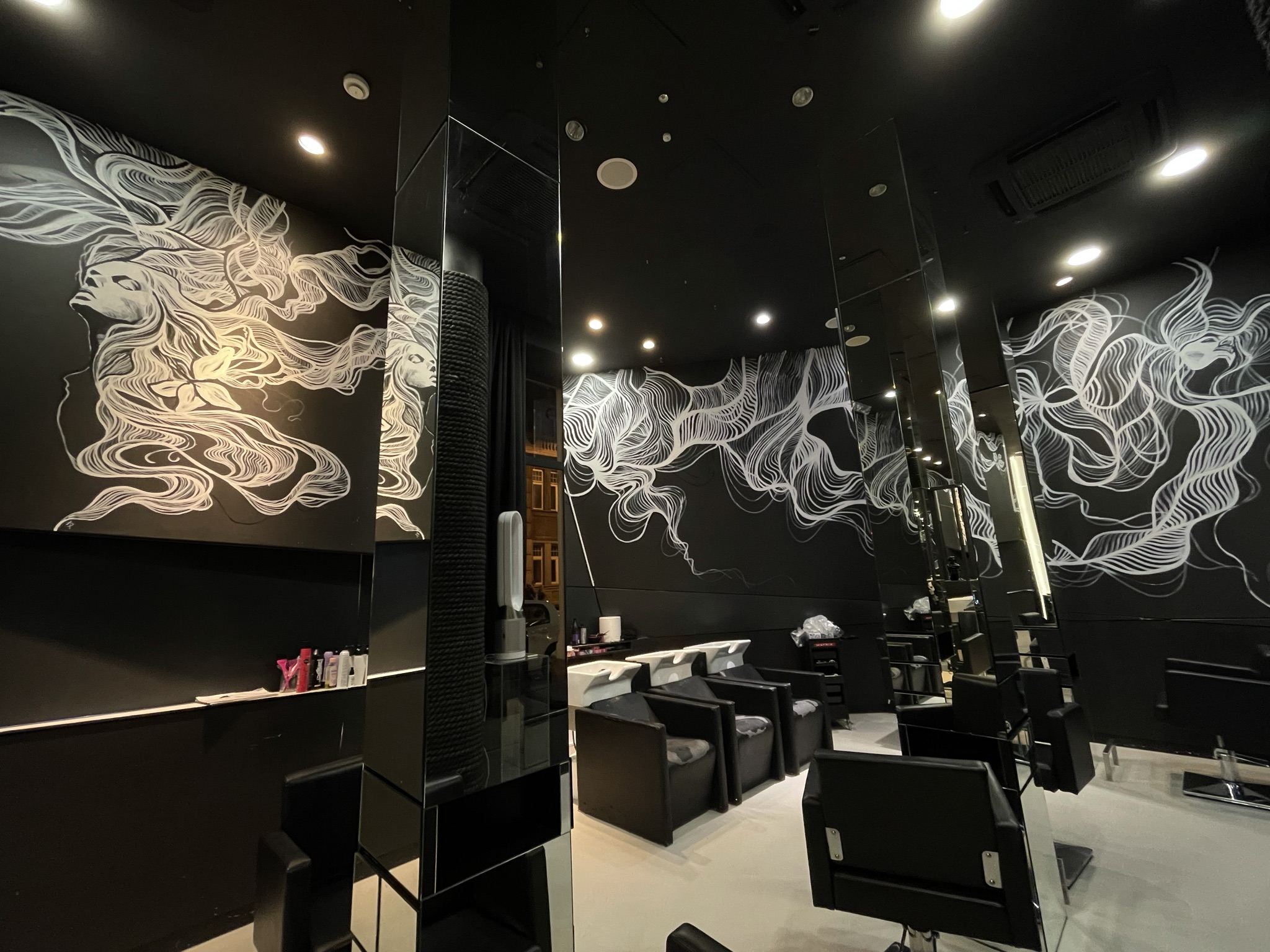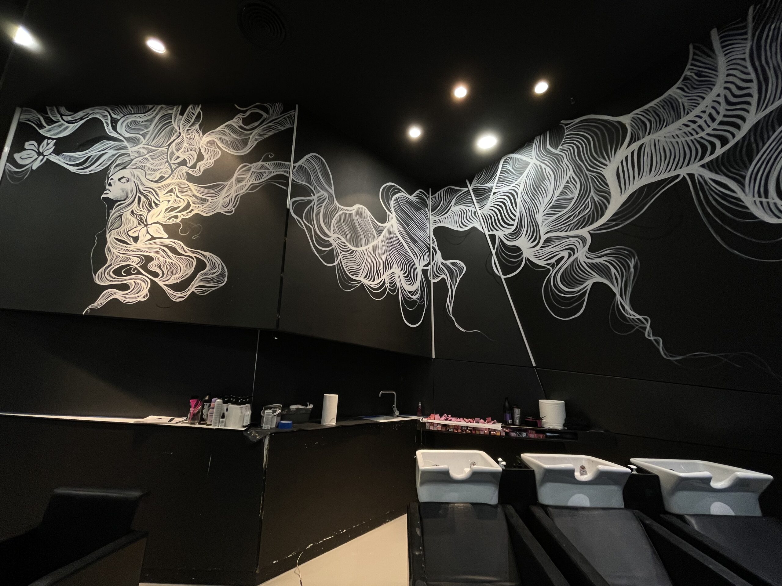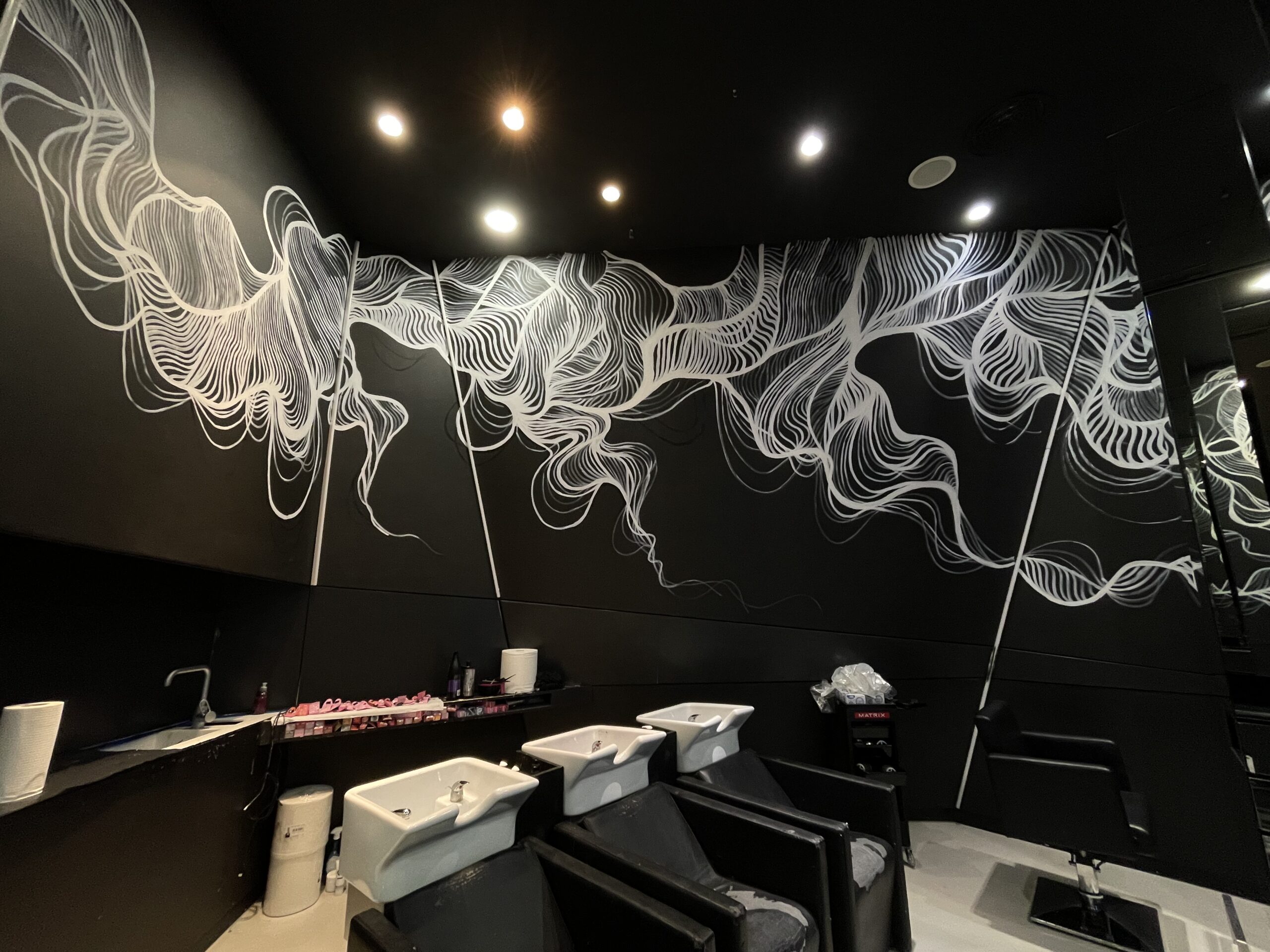A.D.: Tak, jest. Miałem przyjemność wykonać mural w salonie stylisty gwiazd, fryzjera Bartka Janusza, na ulicy Mokotowskiej 19 w Warszawie. Było to dla mnie sporym wyróżnieniem, ponieważ Bartek zaprasza do współpracy różnych artystów i w ten sposób tworzy ze swojego salonu pewnego rodzaju instalację artystyczną. Przestrzeń salonu była dla mnie wyzwaniem. Wysokość 4 m. Praca cały czas na drabinie i do tego trudne dojście w niektórych miejscach, aby w ogóle ją rozstawić. Atrakcji nie koniec, bo czarne ściany salonu były pochylone pod kątem. Stworzyłem twarze dwóch kobiet, które łaczą się włosami. Ale włosy to tylko pretekst do interpretacji muralu. Namalowane białe linie przypominają nić DNA bądź witki meduzy. Mural idealnie komponuje się z lustrami, które potęgują wrażenie nieskończoności. Obraz odbija się we wszystkich lustrach i tworzy efekt ,,kalejdoskopu’’. Realizacja została doceniona przez klientki salonu Bartka m.in. Margaret i Grażynę Wolszczak. Serdeczne zapraszam do obejrzenia tego dzieła.