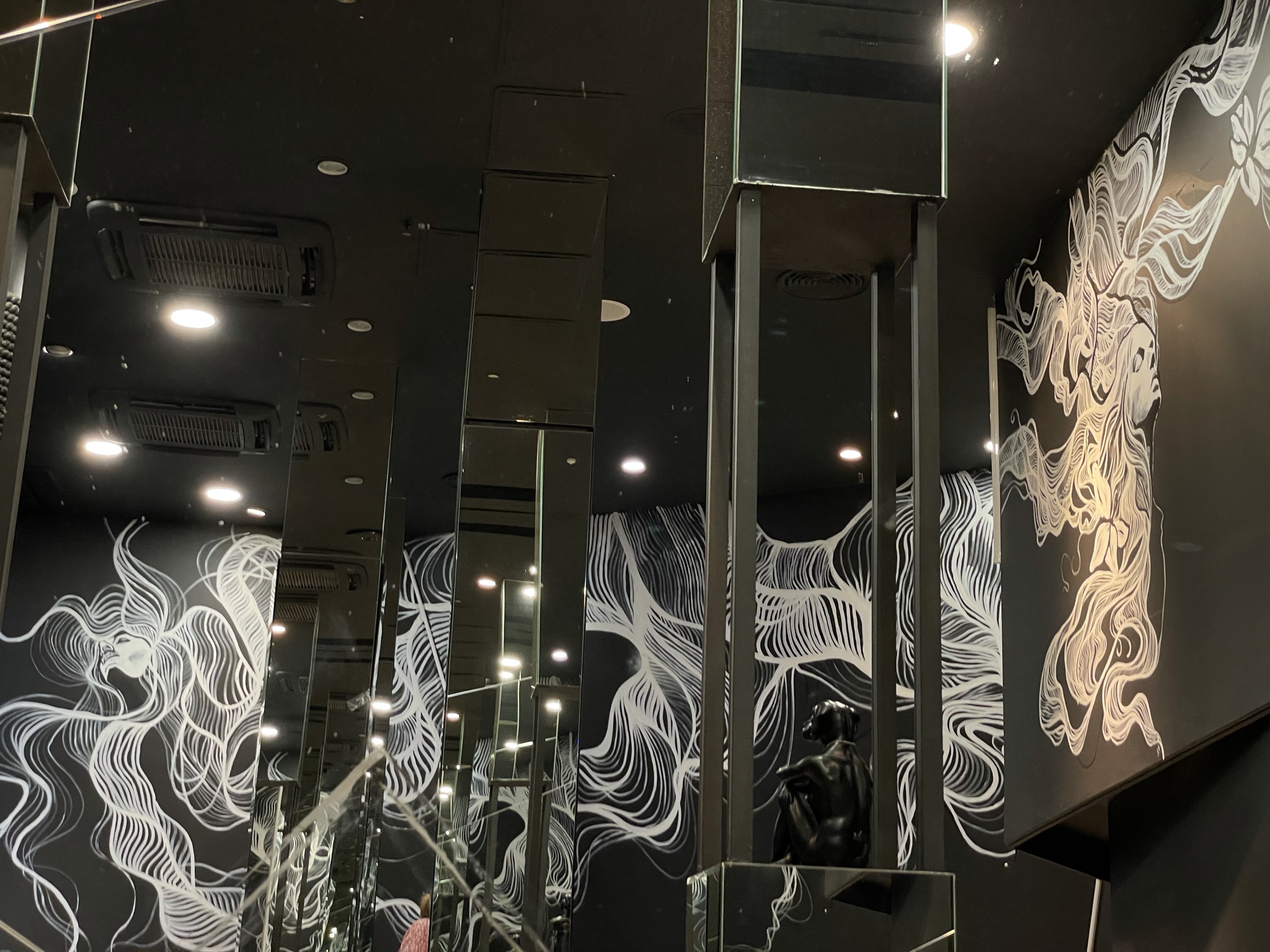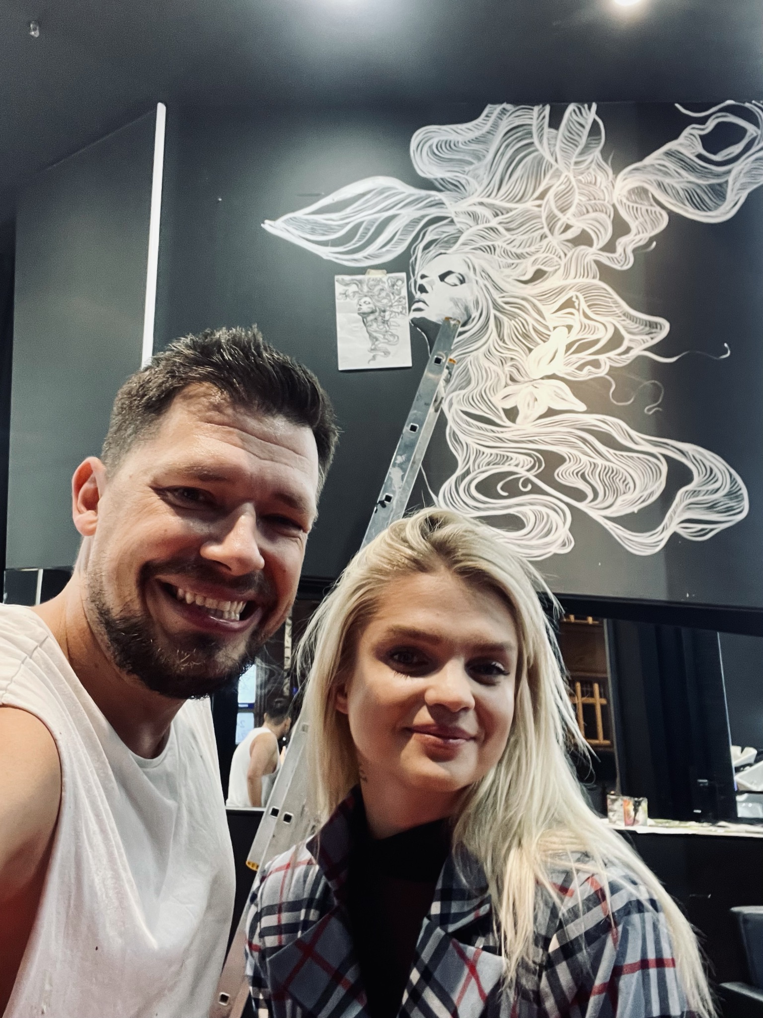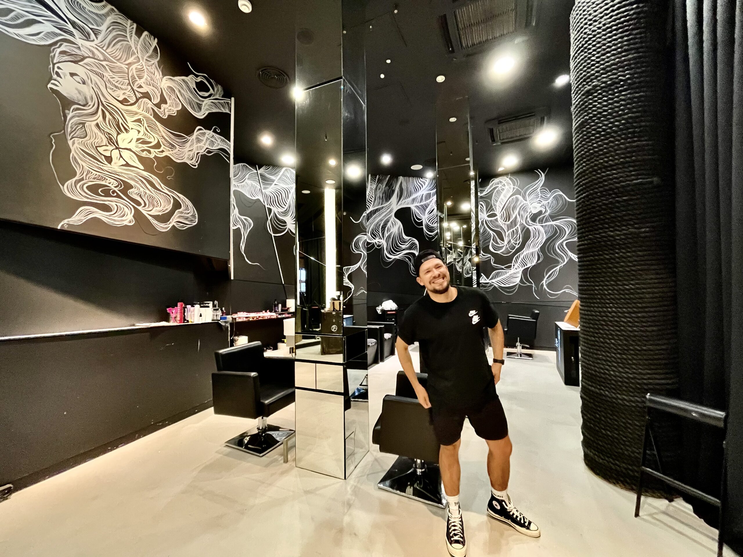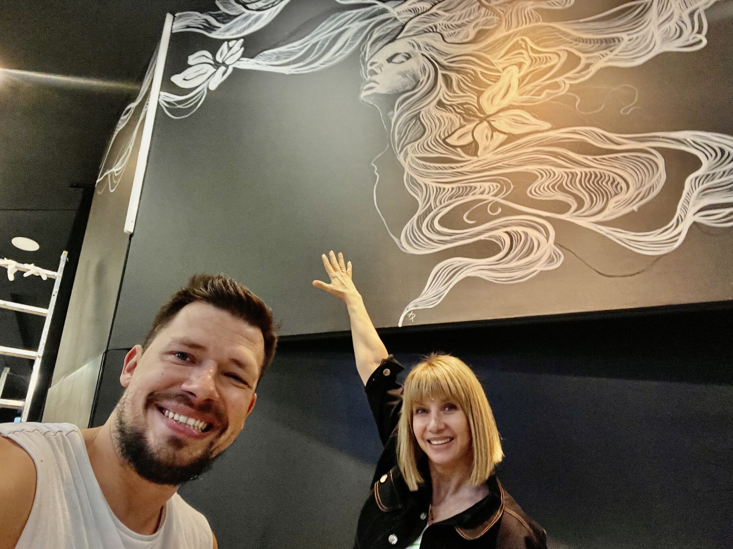 A.D.: Tak, jest. Miałem przyjemność wykonać mural w salonie stylisty gwiazd, fryzjera Bartka Janusza, na ulicy Mokotowskiej 19 w Warszawie. Było to dla mnie sporym wyróżnieniem, ponieważ Bartek zaprasza do współpracy różnych artystów i w ten sposób tworzy ze swojego salonu pewnego rodzaju instalację artystyczną. Przestrzeń salonu była dla mnie wyzwaniem. Wysokość 4 m. Praca cały czas na drabinie i do tego trudne dojście w niektórych miejscach, aby w ogóle ją rozstawić. Atrakcji nie koniec, bo czarne ściany salonu były pochylone pod kątem. Stworzyłem twarze dwóch kobiet, które łaczą się włosami. Ale włosy to tylko pretekst do interpretacji muralu. Namalowane białe linie przypominają nić DNA bądź witki meduzy. Mural idealnie komponuje się z lustrami, które potęgują wrażenie nieskończoności. Obraz odbija się we wszystkich lustrach i tworzy efekt ,,kalejdoskopu’’. Realizacja została doceniona przez klientki salonu Bartka m.in. Margaret i Grażynę Wolszczak. Serdeczne zapraszam do obejrzenia tego dzieła.