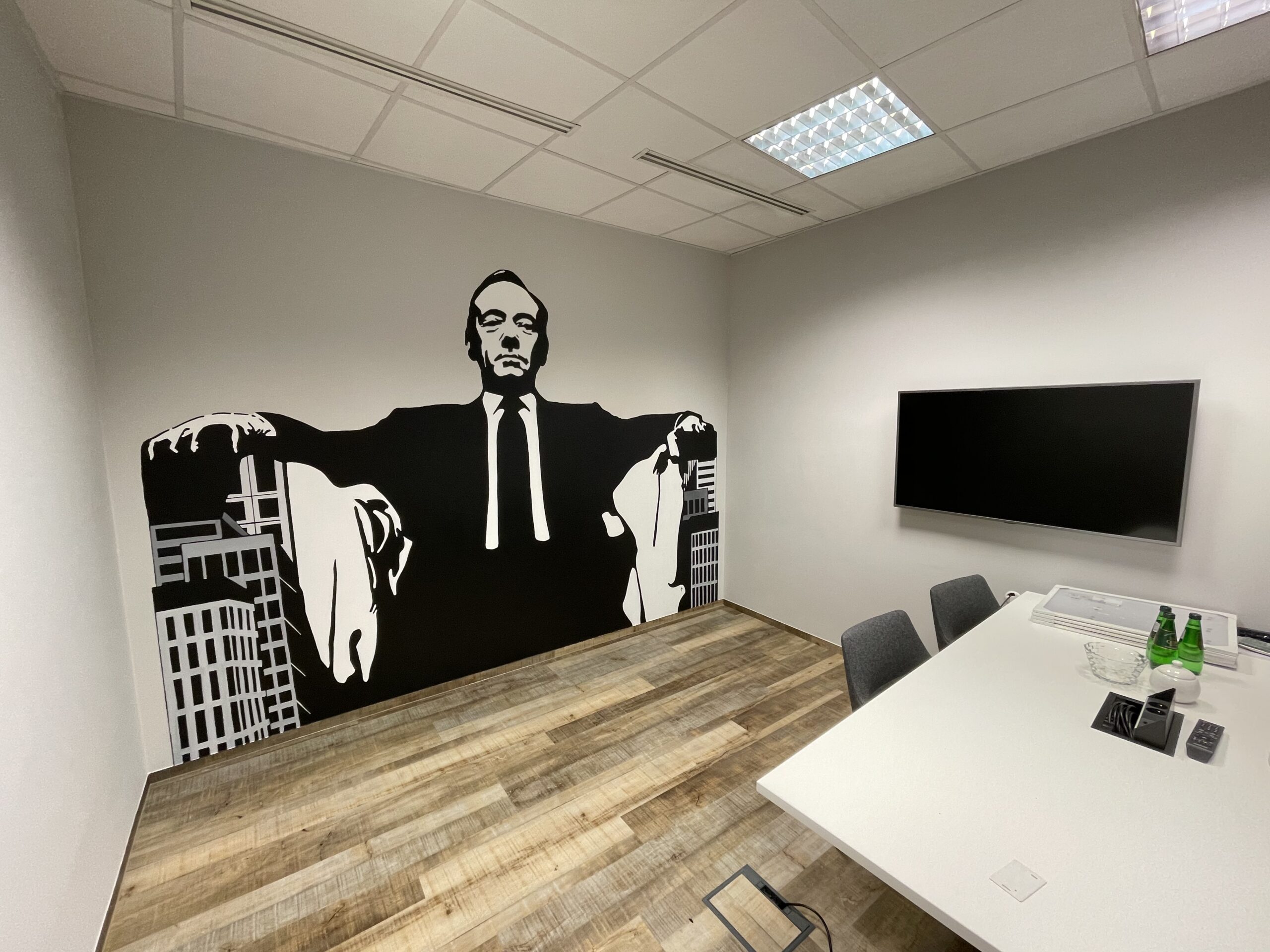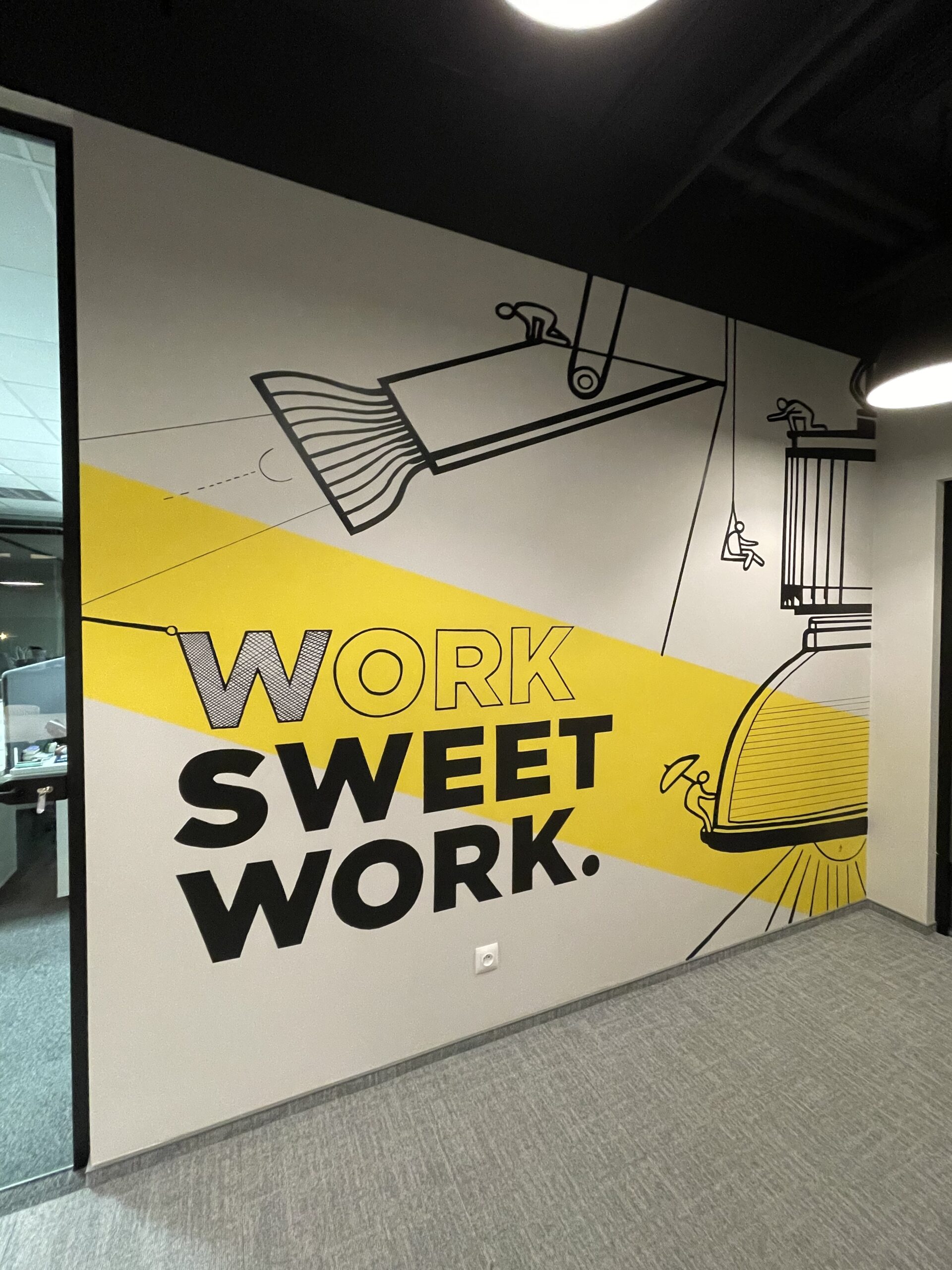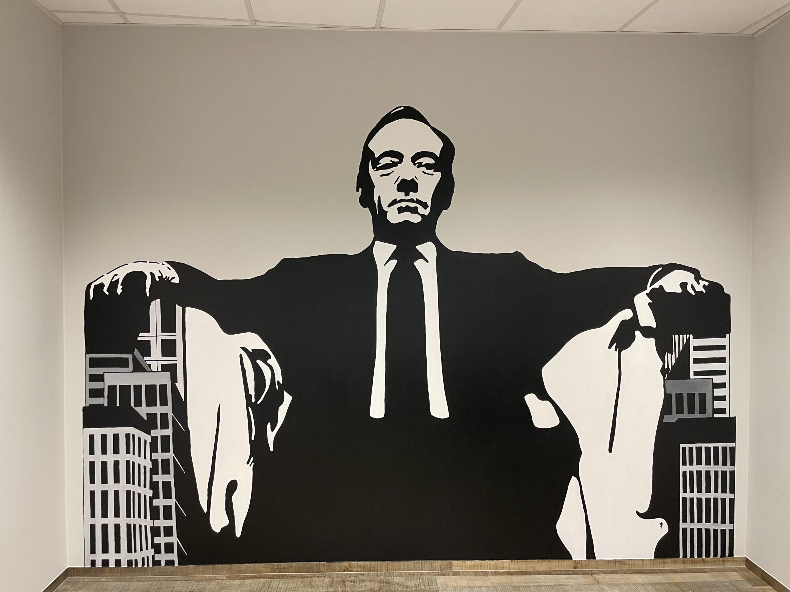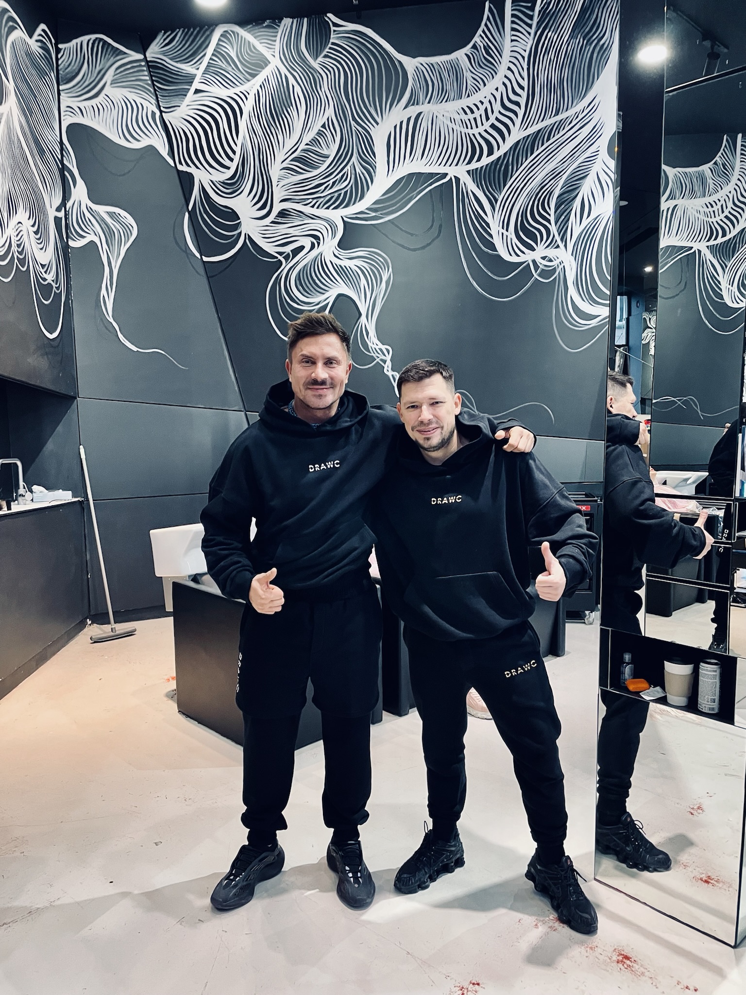 A.D.: Tak, jest. Miałem przyjemność wykonać mural w salonie stylisty gwiazd, fryzjera Bartka Janusza, na ulicy Mokotowskiej 19 w Warszawie. Było to dla mnie sporym wyróżnieniem, ponieważ Bartek zaprasza do współpracy różnych artystów i w ten sposób tworzy ze swojego salonu pewnego rodzaju instalację artystyczną. Przestrzeń salonu była dla mnie wyzwaniem. Wysokość 4 m. Praca cały czas na drabinie i do tego trudne dojście w niektórych miejscach, aby w ogóle ją rozstawić. Atrakcji nie koniec, bo czarne ściany salonu były pochylone pod kątem. Stworzyłem twarze dwóch kobiet, które łaczą się włosami. Ale włosy to tylko pretekst do interpretacji muralu. Namalowane białe linie przypominają nić DNA bądź witki meduzy. Mural idealnie komponuje się z lustrami, które potęgują wrażenie nieskończoności. Obraz odbija się we wszystkich lustrach i tworzy efekt ,,kalejdoskopu’’. Realizacja została doceniona przez klientki salonu Bartka m.in. Margaret i Grażynę Wolszczak. Serdeczne zapraszam do obejrzenia tego dzieła.