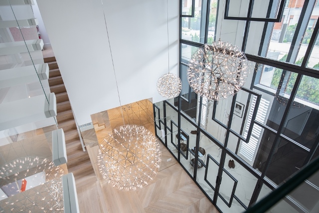 W jasnej, pełnej światła przestrzeni, zawisły „prawdziwe dzieła sztuki” – lampy „Raimond” holenderskiej firmy Moooi.