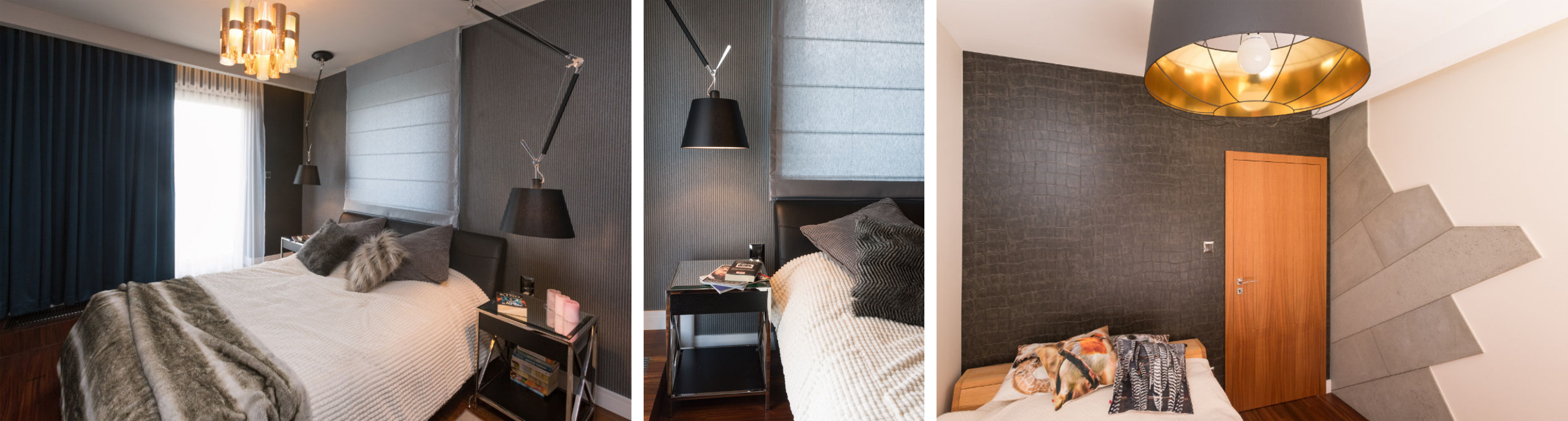 Sypialnie utrzymano w zdecydowanie chłodniejszej kolorystyce niż resztę wnętrz, ale wcale nie oznacza to, że brakuje w nich ciepła! Miękkie światło i przytulne tkaniny zdecydowanie podnoszą temperaturę.