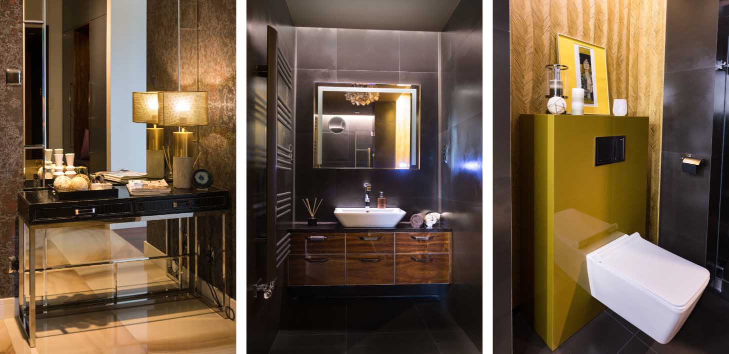 W części dziennej apartamentu znajduje się jeszcze jeden „klejnot” – łazienka zachwycająca połączeniem czarnych ścian i złotych akcentów, przypominająca szkatułkę na cenne precjoza.