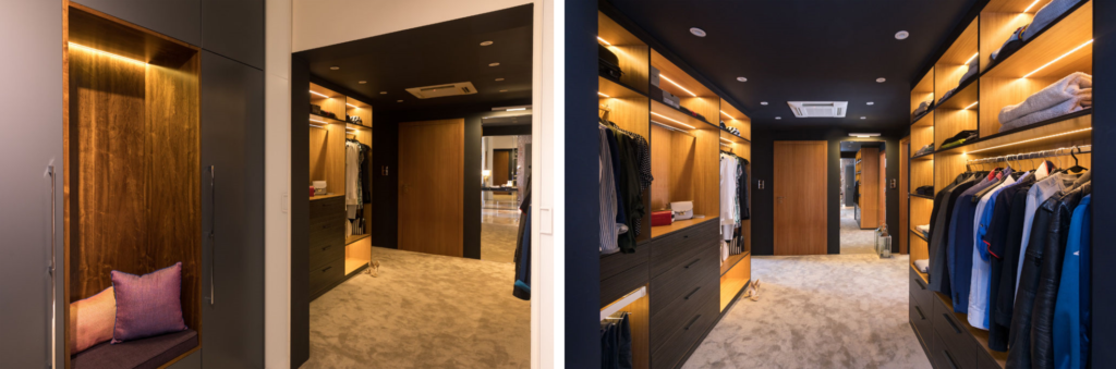 Po ich otwarciu wchodzi się do obszernej garderoby, która została zaprojektowana jak ekskluzywny butik. Tu też królują ciemne kolory – nasycone grafity Baby Seal 2119 – 30 i Blackberry 2119-20 są wzbogacone o chłodne tony, dzięki czemu perfekcyjnie wydobywają złote nuty z fornirów pokrywających podświetlane wnętrza szaf.
