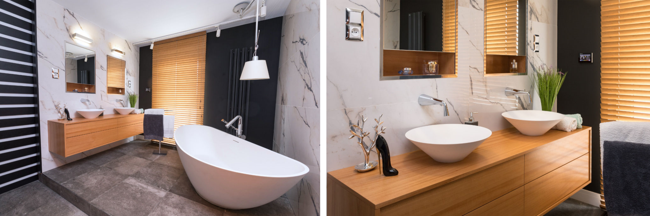 Z garderoby przenosimy się do drugiej łazienki, która z całą pewnością zasługuje na miano salonu kąpielowego. Kolorystyka znacznie się rozjaśnia, ale i tu znalazło się miejsce dla ściany w ciemnym graficie Jet Black 2120-10, który w duecie z bielą podkreśla urodę płytek z kamiennym motywem.
